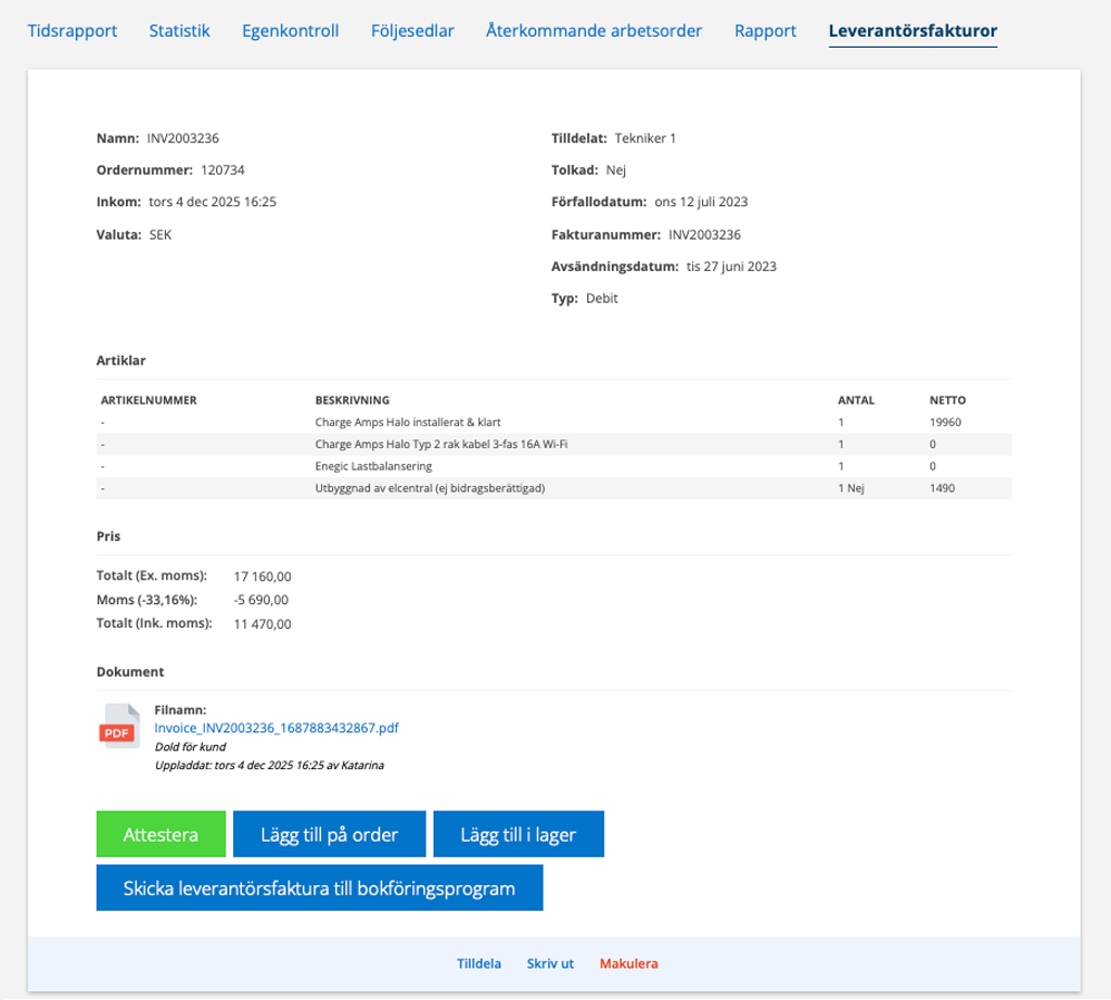 Här laddar du upp leverantörsfakturor som du fått som pdf och kan då lägga till dem på ordrar eller i ett lager samt skicka in fakturorna till ert ekonomi- och bokföringssystem.