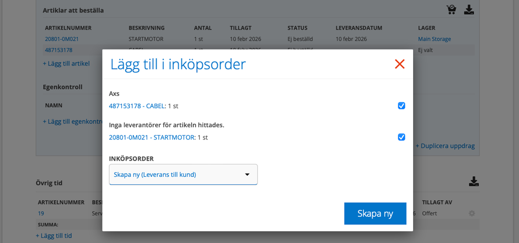 Har du lagt till artiklar på en arbets- eller serviceorder som ska skickas direkt till kunden? När du skapar inköpordern kan du välja Skapa ny (leverans till kund) så skickas en leveransadress med till inköpsorder. Leveransadressen hämtas från offert, anläggning eller kund – i den ordningen.