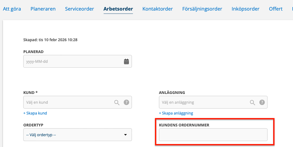 Vi flyttade upp fältet för kundens ordernummer till övre delen av order. Detta gäller alla funktioner.