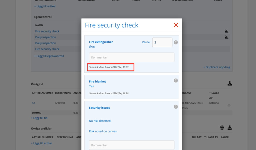 Kan du inte göra färdig en egenkontroll klickar du på Klar för att spara det du gjort. Datum och klockslag läggs till på varje punkt som är utförd när du sparar.