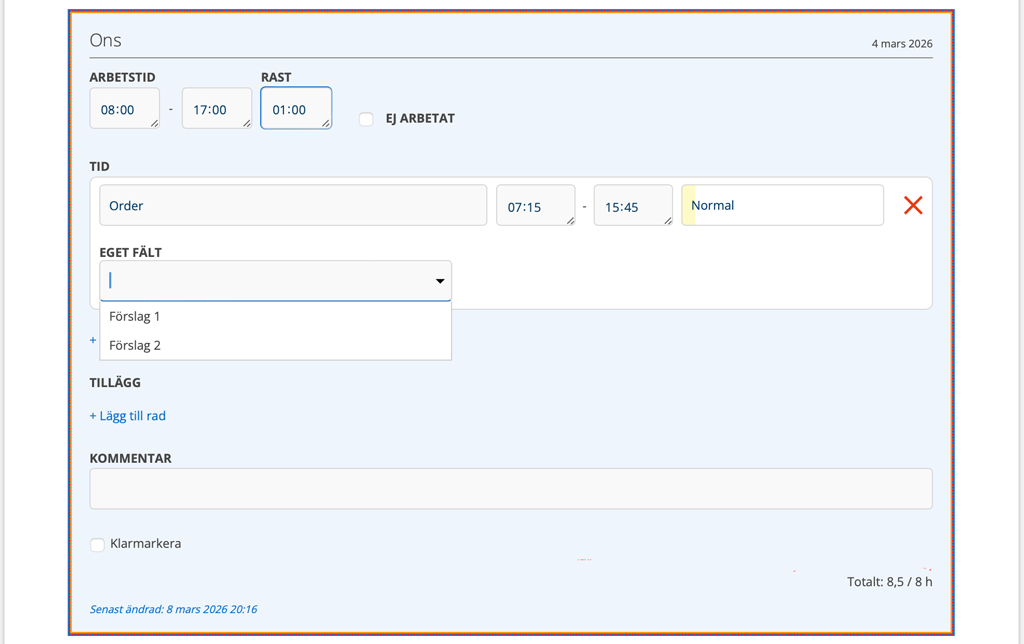 I bild 3 har vi lagt till ett ”EGET FÄLT” och ställt in ett par ”Förslag” samt använder Tidsrapportinställningen ”Ange tid med start och slut”. Notera att denna inställningen inte kan ta hänsyn till inställda raster utan du måste själv lägga in tider du faktiskt arbetat.