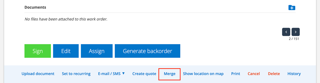 If you have admin permissions, you can see and use the Merge work order function. This gives you the option to merge two orders when there are duplicates or if you want to merge two jobs on the same order.