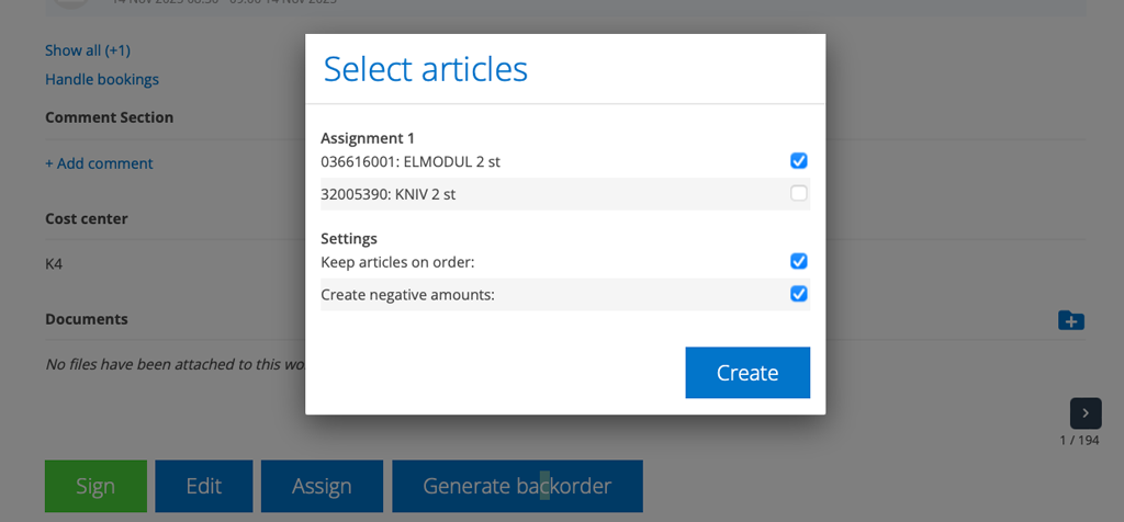 If you are going to create a credit order from an work order, you can select Create negative amount and the quantity will be entered with a minus sign (- 1).