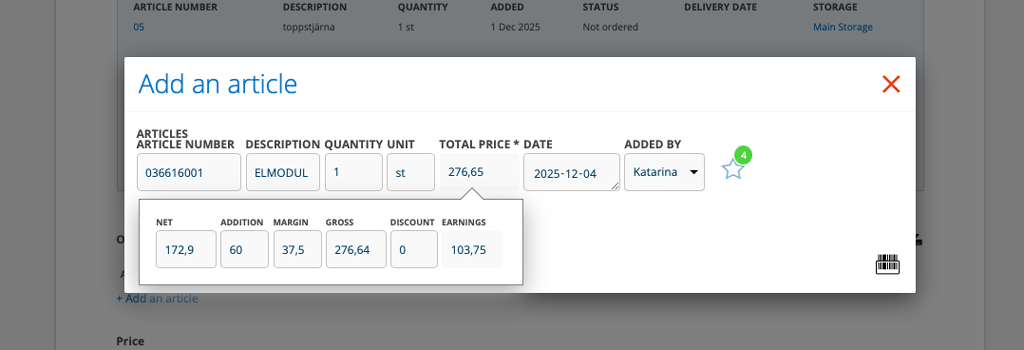 When you add an item and open the price field, there is now a new field – MARGIN. Here you can specify the margin in % that the item should have. The addition is automatically updated when you change the margin and vice versa.