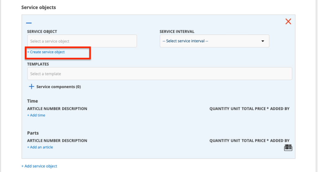 When you create a new service order, you can add a new service object directly and specify the service interval, service points and parts at the same time. The information is saved on the service object and controls the next service. Currently, this does not work if the object is a time-based service object and it does not apply if you select a model on the new service object.