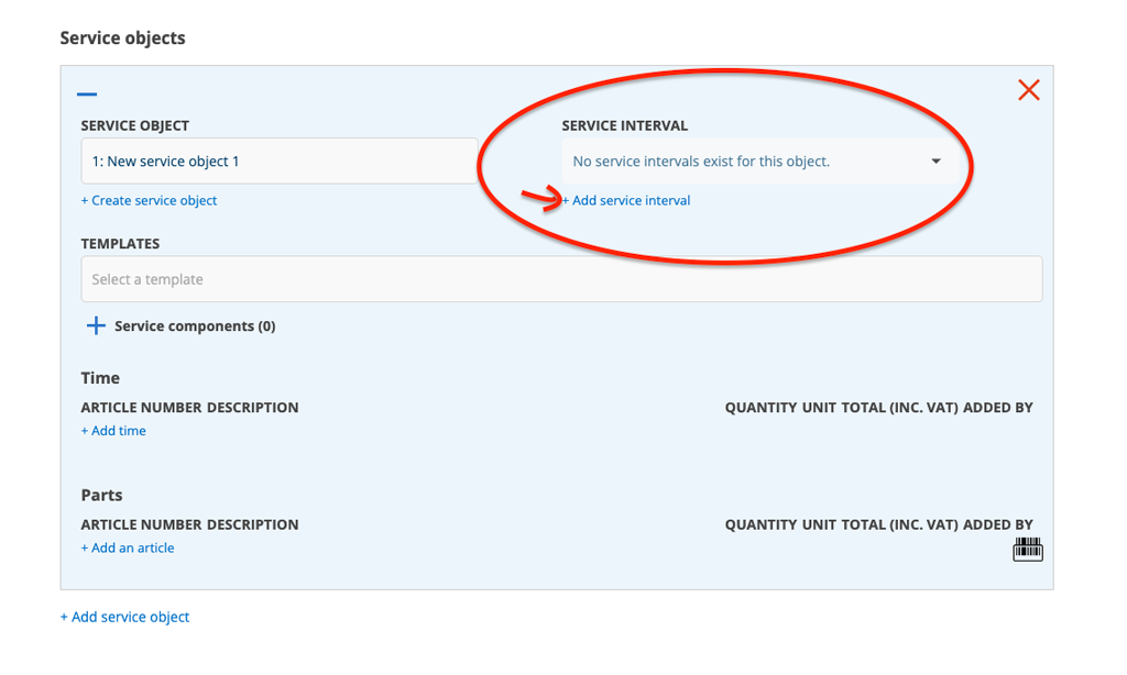 - The SERVICE INTERVAL field will now read “No service intervals exists for this object”. Then click + Add service interval. A field will open where you enter the number of days for the interval. The service interval name is named after the number of days.