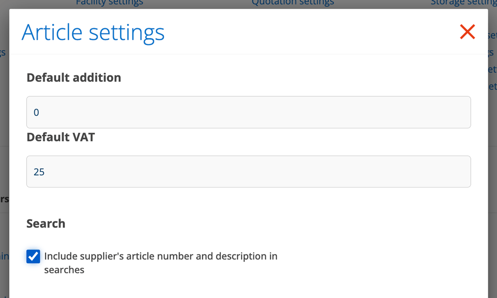 If you want to be able to search also on suppliers’ article numbers and descriptions here, a setting is required for that under Group settings – Module settings – Article settings. To make this setting, admin permissions are required.
