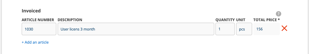 Article that are included in the agreement. These can be, for example, support time. Example: 5 hours of the article support time. When the agreement generates a sales order, this number is automatically checked and any excess quantity is invoiced.