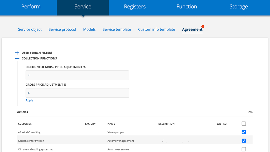 Here you link the service object(s) that may be included in the agreement. For each service object, you specify articles that should be discounted, included and/or invoiced.