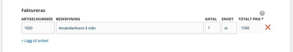 Here you specify articles to be invoiced each time period. Usually a fixed amount in the form of an article called a support agreement, rental agreement or similar.