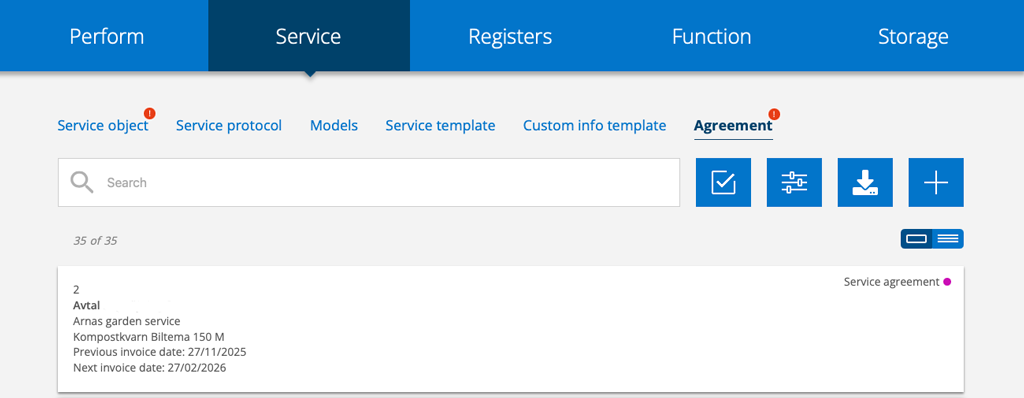 Start by adding your contract variants as articles in the Article Register. All orders, service protocols, service objects and models linked to the contract are then listed under that article. Here are some examples of how our customers name their contract articles: Quarterly Service Agreement, Apartment Rental Agreement, Standard Agreement, L-1020, A-01…