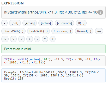 Fill in an equation in the EXPRESSION field if you wish to set conditions (expressions) for the price of articles from this particular supplier. The equation can, for example, be used to give different markups for different price levels (markup steps)