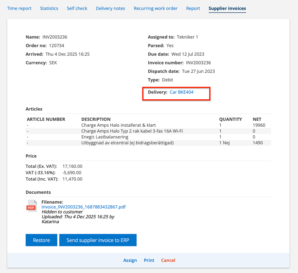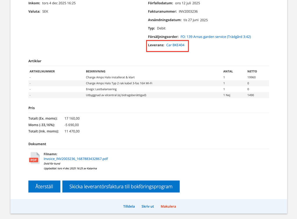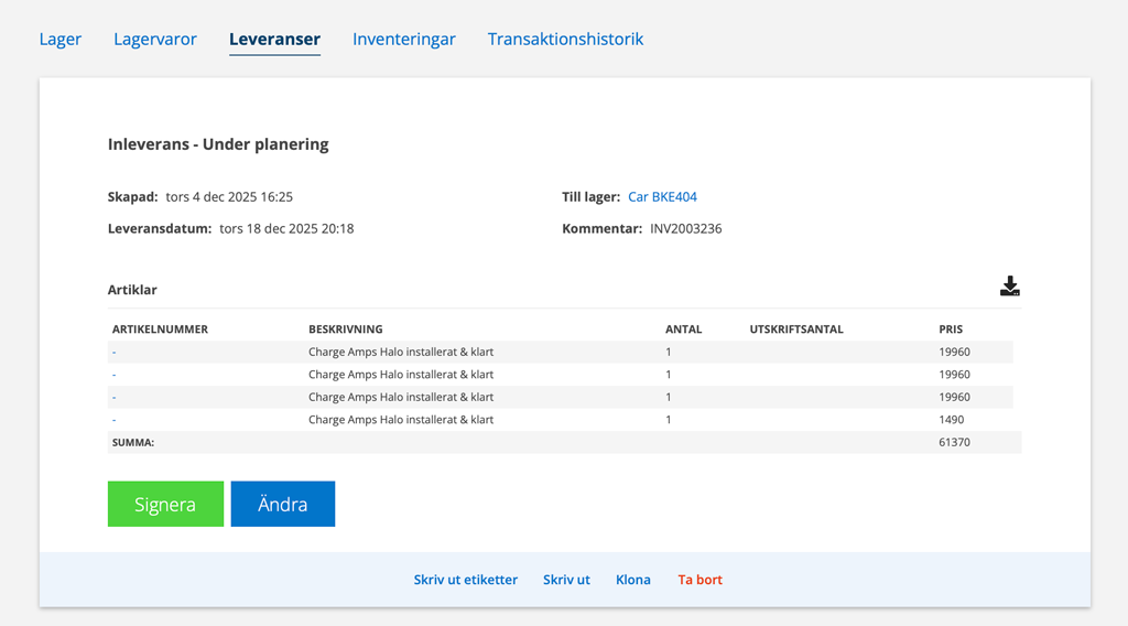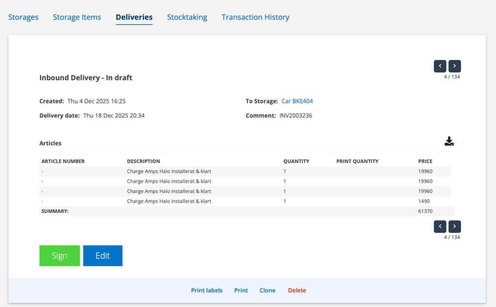 A link to the storage is added under the heading Delivery:. Click on the storage to complete the delivery and possibly remove articles that should not be placed in the storage.