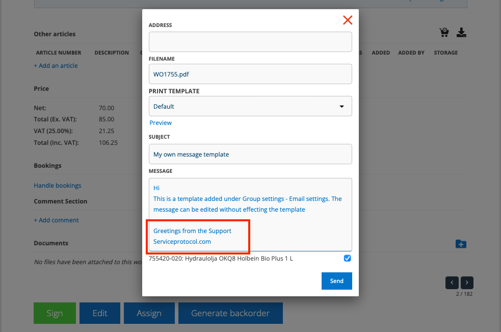 Do you want to formulate your own text for sending a message linked to a work order? For example, notification that an ordered product is available for collection? The message can be sent as e-mail and/or SMS.