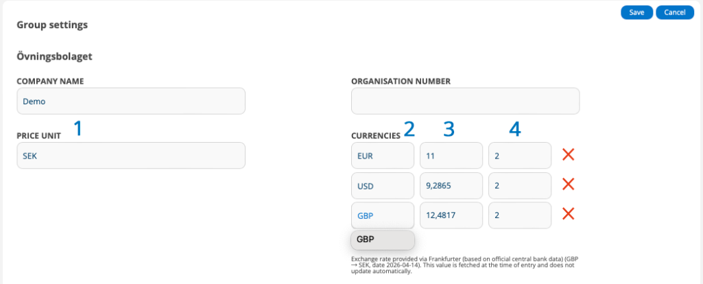 When both your group’s base currency (Price Unit) and another currency are entered correctly, a current exchange rate is automatically retrieved and filled in field (3). A text is displayed with information about which currencies and the date of the retrieval.