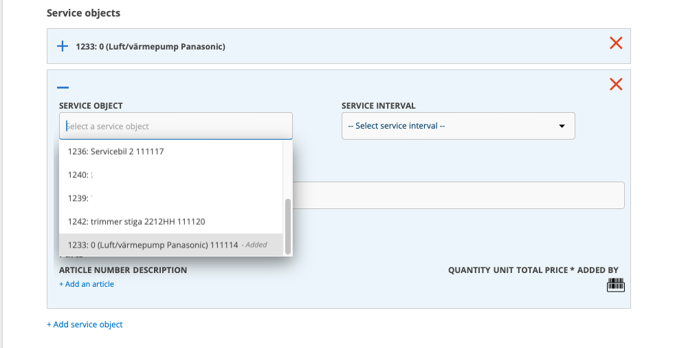 If you need to add the same service object again, you will find these at the bottom of the list of service objects with the information that the object has already been added.