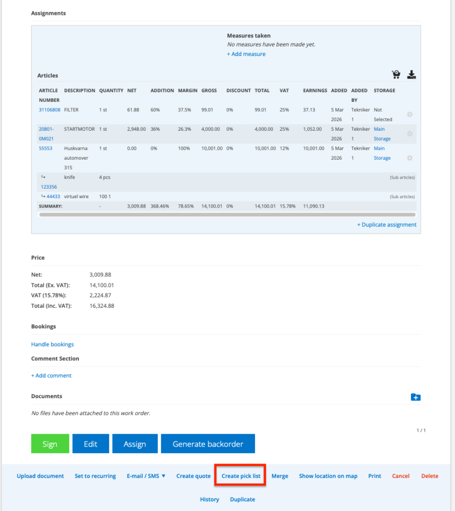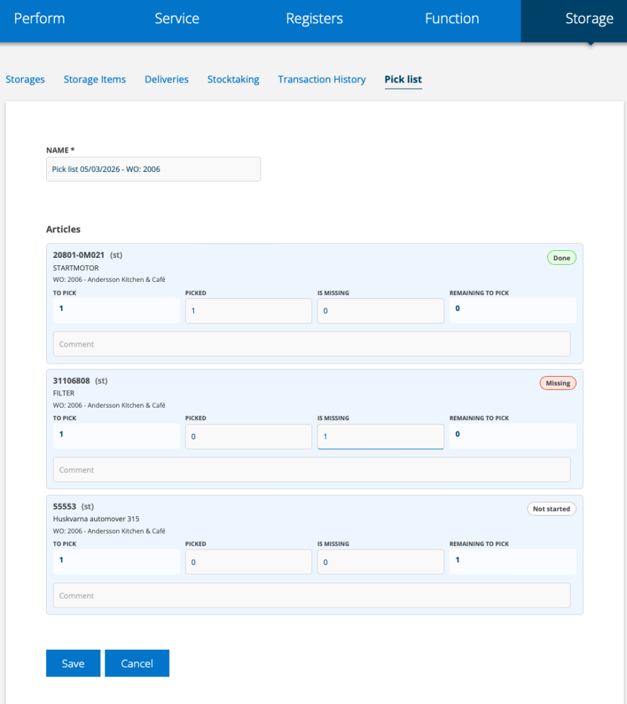 The picking list under Storage is used to include and check that all articles for a job are available in the storage.