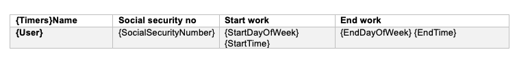 | {Timers} | Create a table with the fields below – see example below. The tags can be used on service orders and work orders |