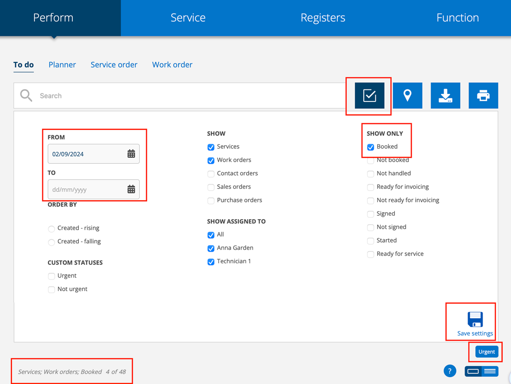 When you sign in to the system, you start at the Perform – To Do menu. Here you see orders that have not yet been performed or needs to be handled.