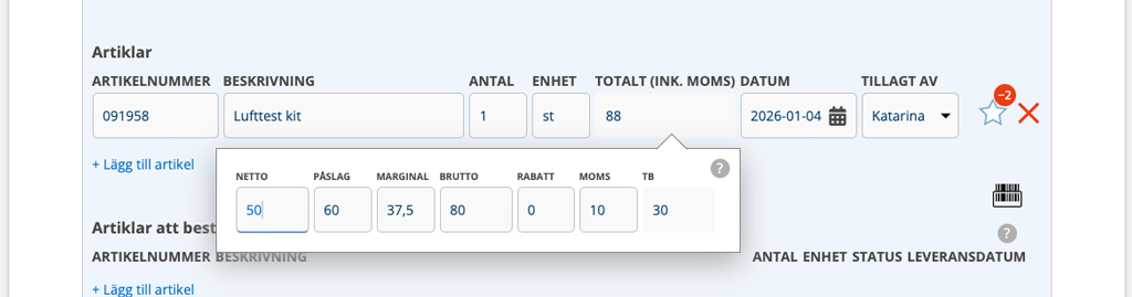 - I redigeringsläge (Ändra) visas totalpris per rad inkl. moms, medan detaljvy visar pris exkl. moms.