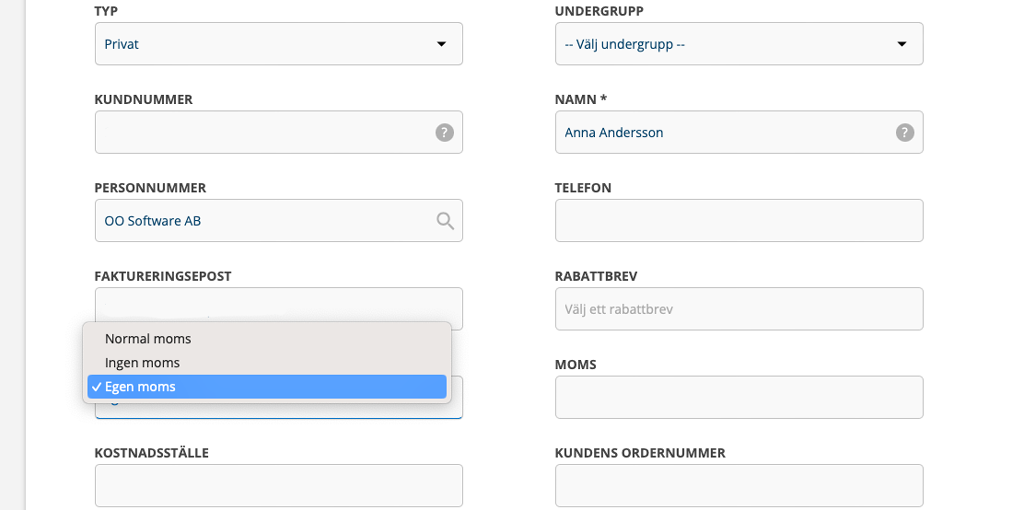 - Fältet MOMS aktiveras. Fyll i momsen som ska gälla för denna kund (du behöver inte skriv in % utan endast siffran)