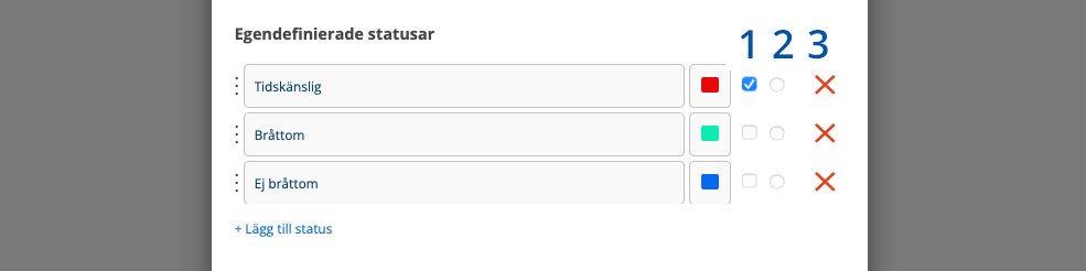 Klicka på +Lägg till status. I ett textfält skriver du in de olika uttryck för status ni vill använda. Välj färg som statusen ska få i listan över arbetsordrar.