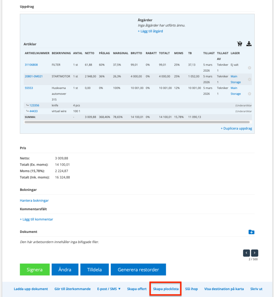 - Klicka på Skapa plocklista. En så skapas en plocklista med alla artiklar på ordern.