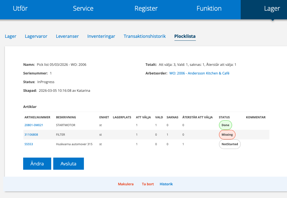 - På en serviceorder med status Ej hanterad. Är ordern påbörjad kan du inte längre skapa en plocklista.