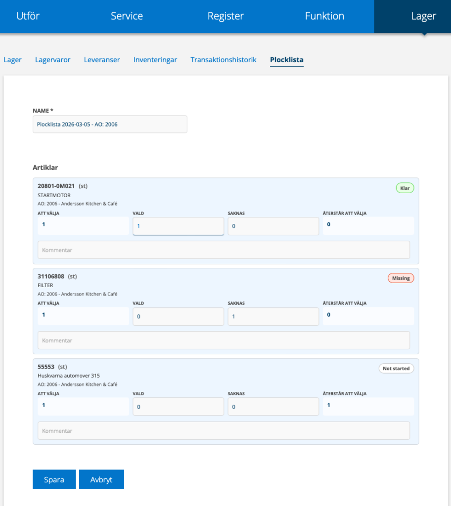 Plocklistan under Lager används för att få med sig och kontrollera att alla artiklar inför ett arbete finns tillgängliga i lagret.