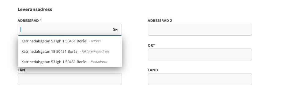 Välj en av kundens adresser. Samtliga kundens adresser (med information vilken det är) listas när du sätter markören i adressfältet.
