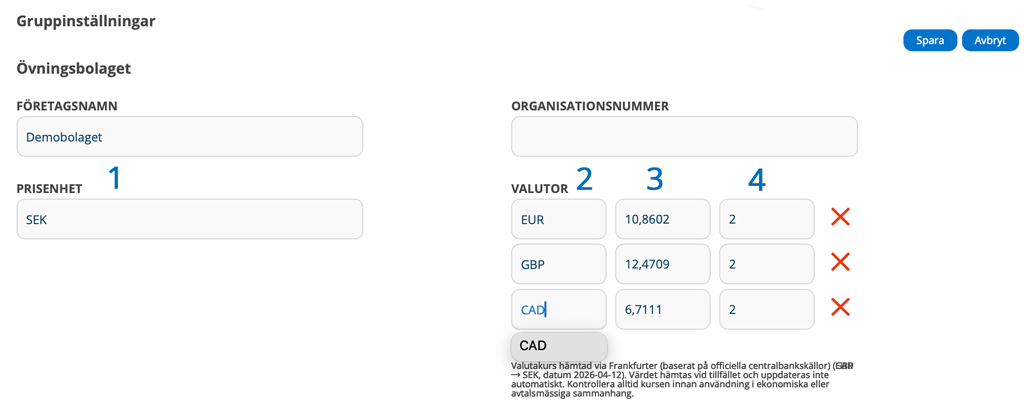 När både din grupps basvaluta (Prisenhet) och en annan valuta är korrekt angivna hämtas en aktuell växelkurs automatiskt och fylls i fältet (3). En text visas med information om vilka valutor och datum för hämtningen.
