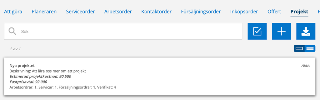 Under ett projekt kan du samla alla offerter, avtal, ordrar (serviceorder, arbetsorder, försäljningsorder) och läcksökningar (om ni använder den funktionen) kopplade till ditt projekt. För att anpassa projekt kan du skapa egendefinierade fält.