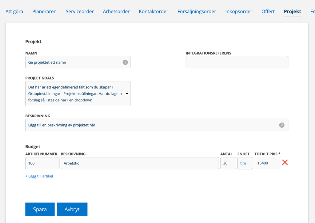 - Ge projektet ett namn och fyll i en beskrivning. samt eventuellt Integrationsreferens och Budget (artiklar).