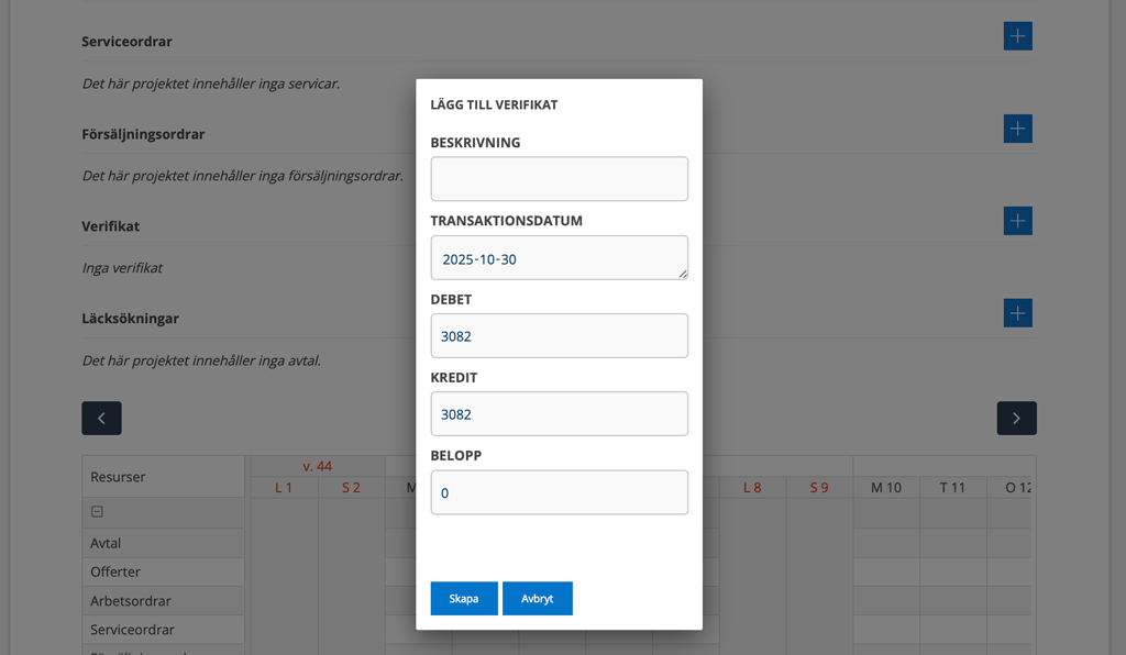 Verifikat används för att skapa händelser i er bokföring om ni t. ex. använder er av faktureringsmetoden Successiv Vinstavräkning (SVA).