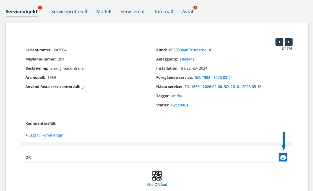 - Gå till serviceobjektet, klicka på skrivarsymbolen till höger på objektet. Välj din uppladdade mall och skriv ut dokumentet. Sätt upp dokumentet med QR-koden på serviceobjektet.