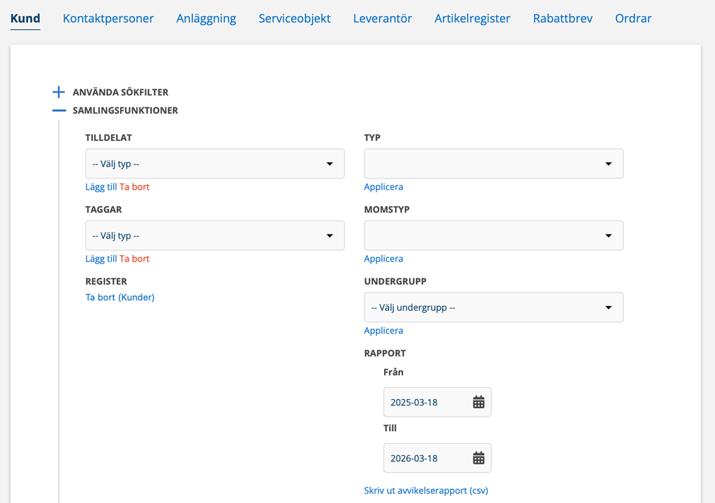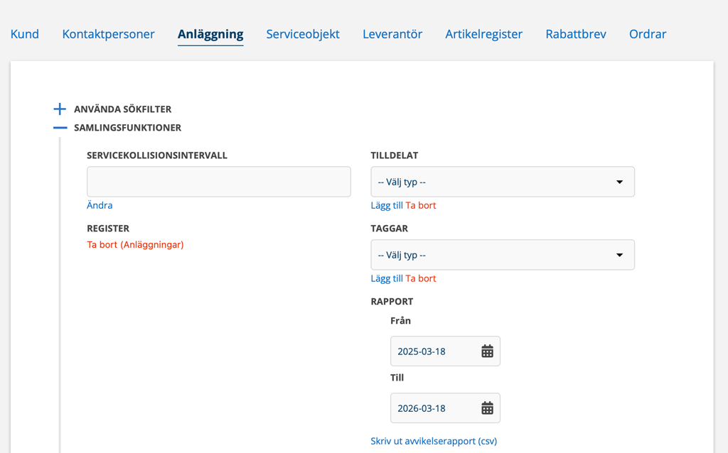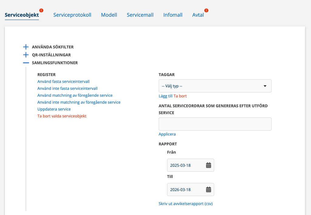 - rapport – ta ut avvikelserapport (denna rapportmöjlighet finns under kund, anläggning, serviceobjekt och serviceprotokoll)