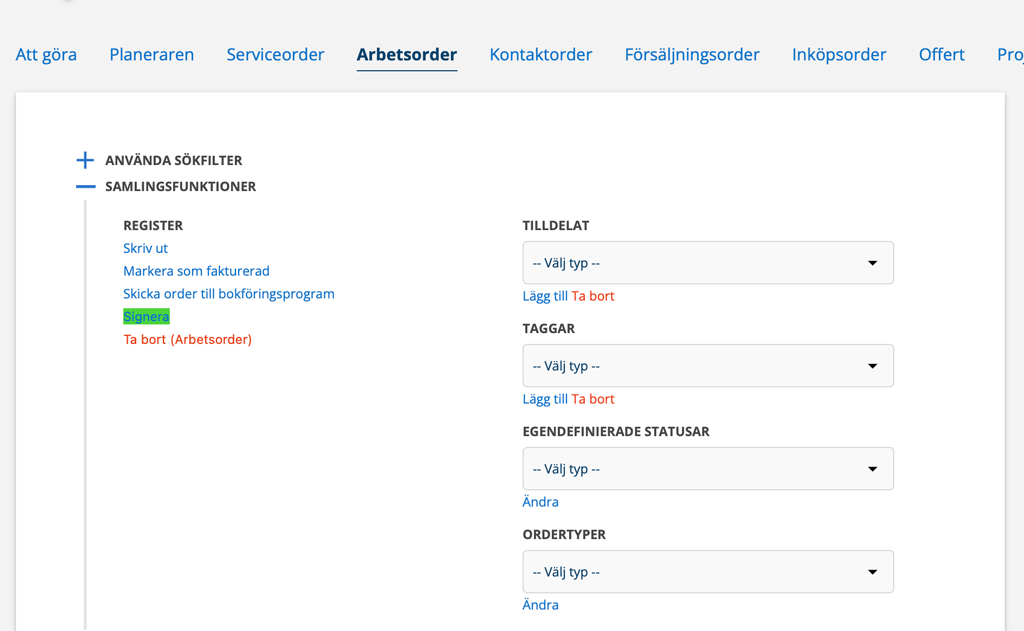 För Arbetsorder ger samlingsfunktionen möjlighet att: