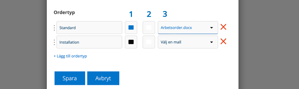 Ange ett namn för ordertypen. Välj färg på fältet genom att klicka på vänstra ”knappen” (siffran 1 i bilden nedan). Färgen finns med som en prick efter typen. Ruta två är textfärgen och behöver inte ställas in.