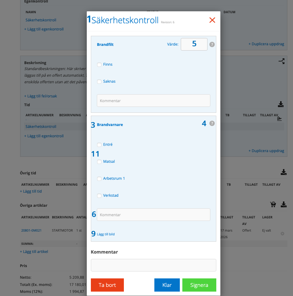 - Har kommentar. Här väljer du om punkten ska innehålla fält för en kommentar. På bild ”Säkerhetskontroll” ser du var fälten för kommentar hamnar.