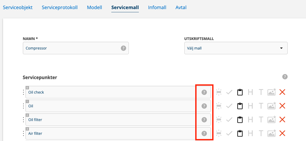 Håll muspekaren över symbolerna när du skapar din servicemall så får du information vad symbolen betyder.