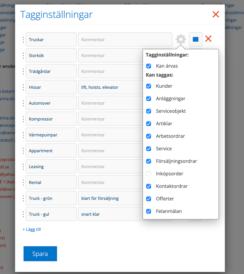 - Klicka på kugghjulet och välj var taggen ska kunna användas. Taggen är valbar endast på de ställen du valt. Vill du att taggen ska hänga (ärvas) med när du genererar ordrar från en kund, anläggning eller serviceobjekt markerar du ”Kan ärvas”.