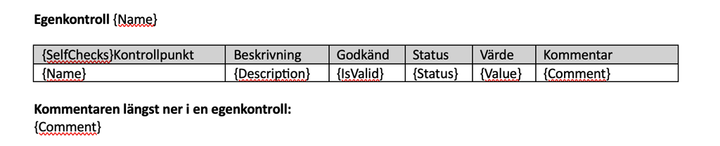 | {FacilityServiceCheckPoints} | Tabellen byggs på samma sätt som {ServiceCheckPoints}. Använd taggarna: {ServiceCheckPointLabel} {ServiceCheckPointValue} {ServiceCheckPointStatus} {ServiceCheckPointComment} |