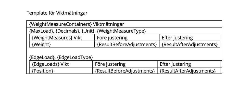 | {Weight} {ResultBeforeAdjustments} {ResultAfterAdjustments} | Vikt Före justering Efter justering |