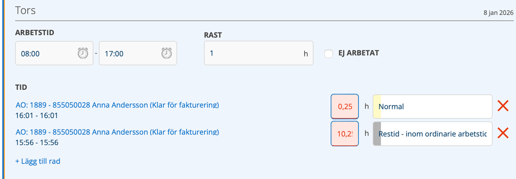 - Röd ram – tiderna stämmer inte med inlagd arbetstid, för få timmar redovisade
