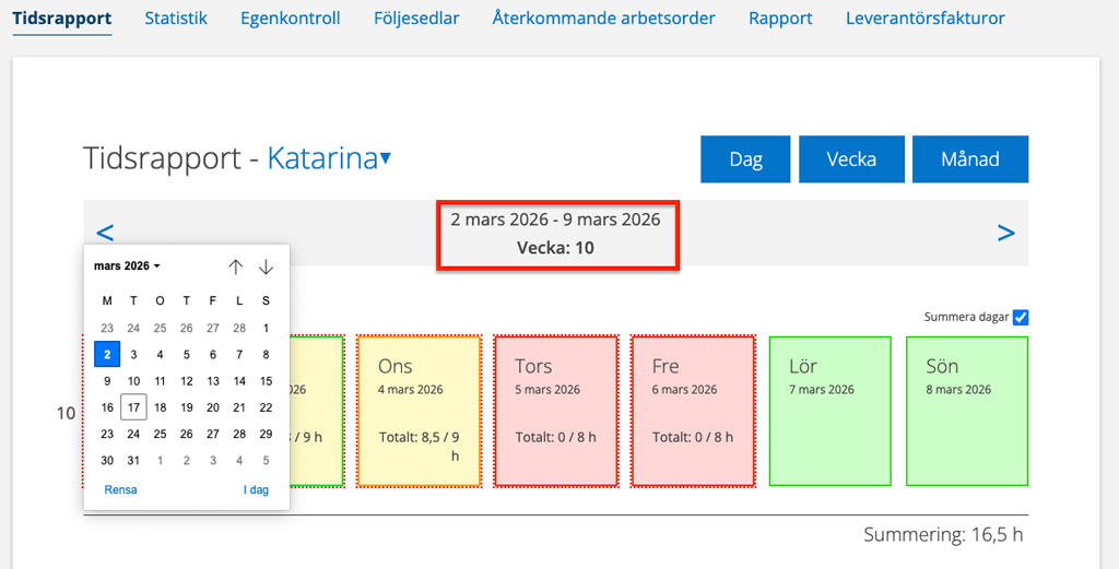 För att ändra en tidsrapport, klicka på dagen du vill ändra.