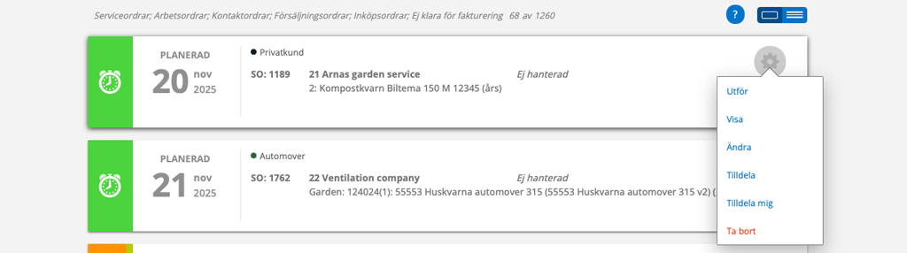 Använd kugghjulet i listor för att snabbt Tilldela, Ändra, Utföra eller fortsätta på en redan påbörjad serviceorder.