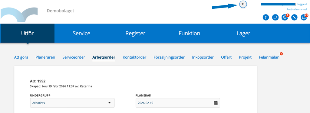 Om det är fler än du som samtidigt klickat på Ändra på en order eller ett kundkort ser du en symbol för varje person i övre högra hörnet före ditt användarnamn.