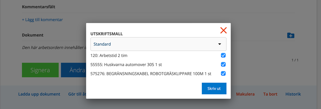 Inställningen påverkar även utskrifter (när du klickat på Skriv ut på en order) så att du kan välja vilka artiklar som ska följa med på utskriften.