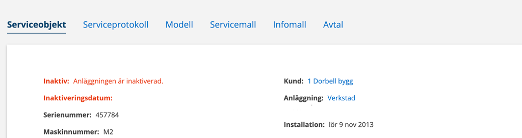 Notera att de serviceobjekt som finns på anläggningen inte aktiveras igen då ett serviceobjekt kan vara inaktiverat av annan anledning än att du inaktiverat anläggningen. Du ser detta genom att serviceobjektet har en egen inaktiveringsanledning och ett datum angivet i fältet Inaktiveringsdatum.