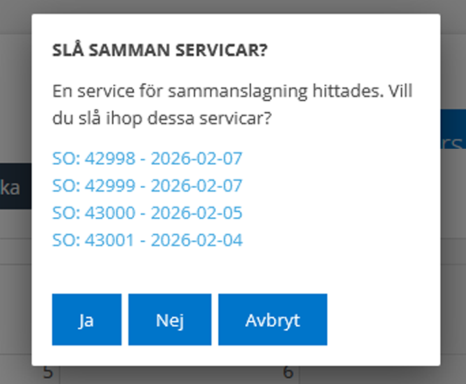 Du får upp denna popup med frågan om du vill slå ihop dessa servicar. Svarar du nej är varje service fortsatt en egen order. Svarar du ja läggs serviceobjektet ihop på en order.